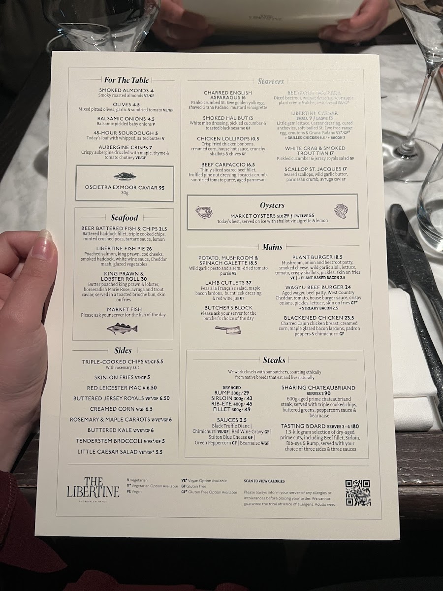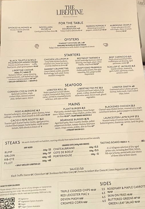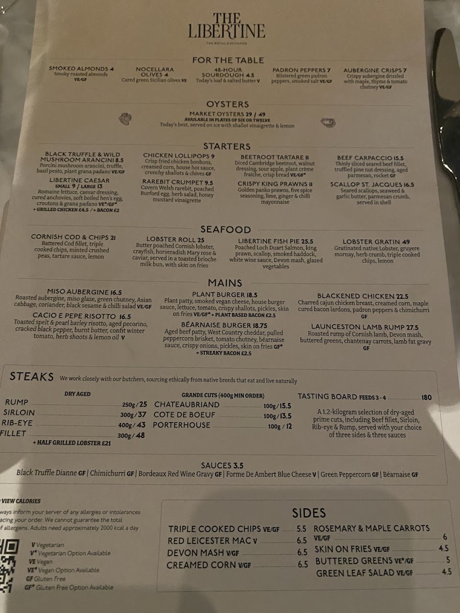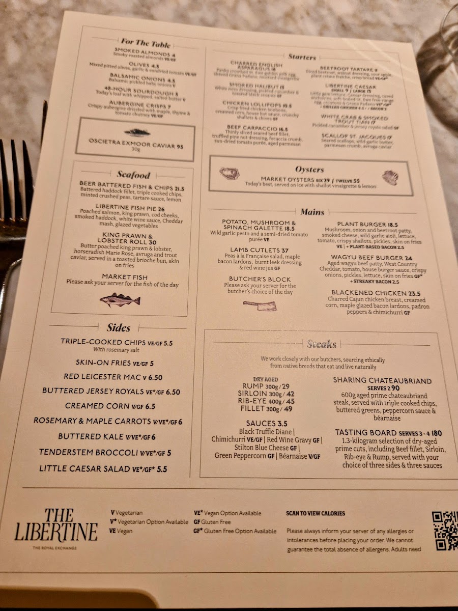 The Libertine Restaurant & Bar, nestled within London’s iconic Royal Exchange, offers a refined take on modern British and European cuisine. The menu is a celebration of classic flavors with contemporary flair, featuring standout dishes like their beer battered fish & chips—crispy haddock with minted peas and tartare sauce—and the indulgent Libertine fish pie, rich with poached salmon, king prawns, and smoked haddock under a creamy Cheddar mash. Seafood lovers will appreciate the delicate freshness of market oysters and the luxurious king prawn & lobster roll, elevated by horseradish Marie Rose and trout caviar.