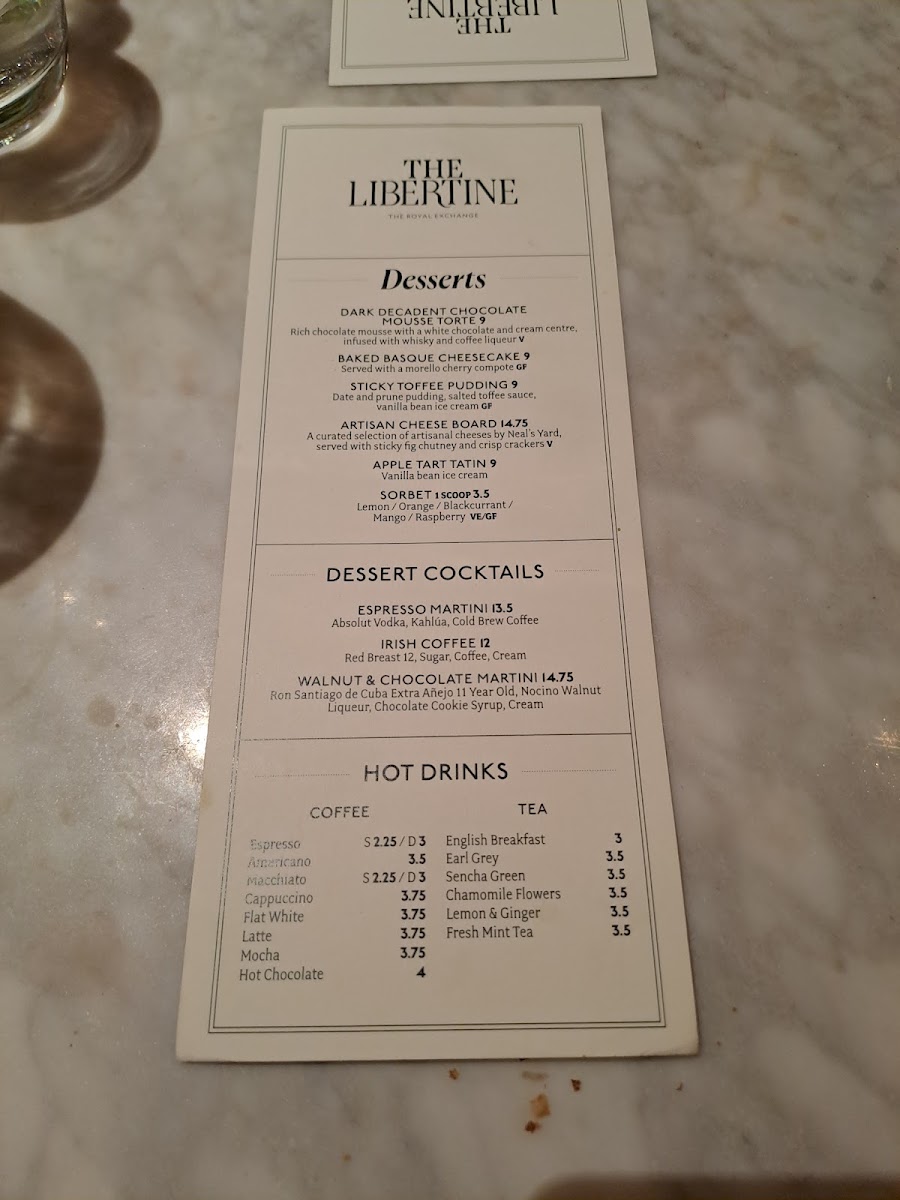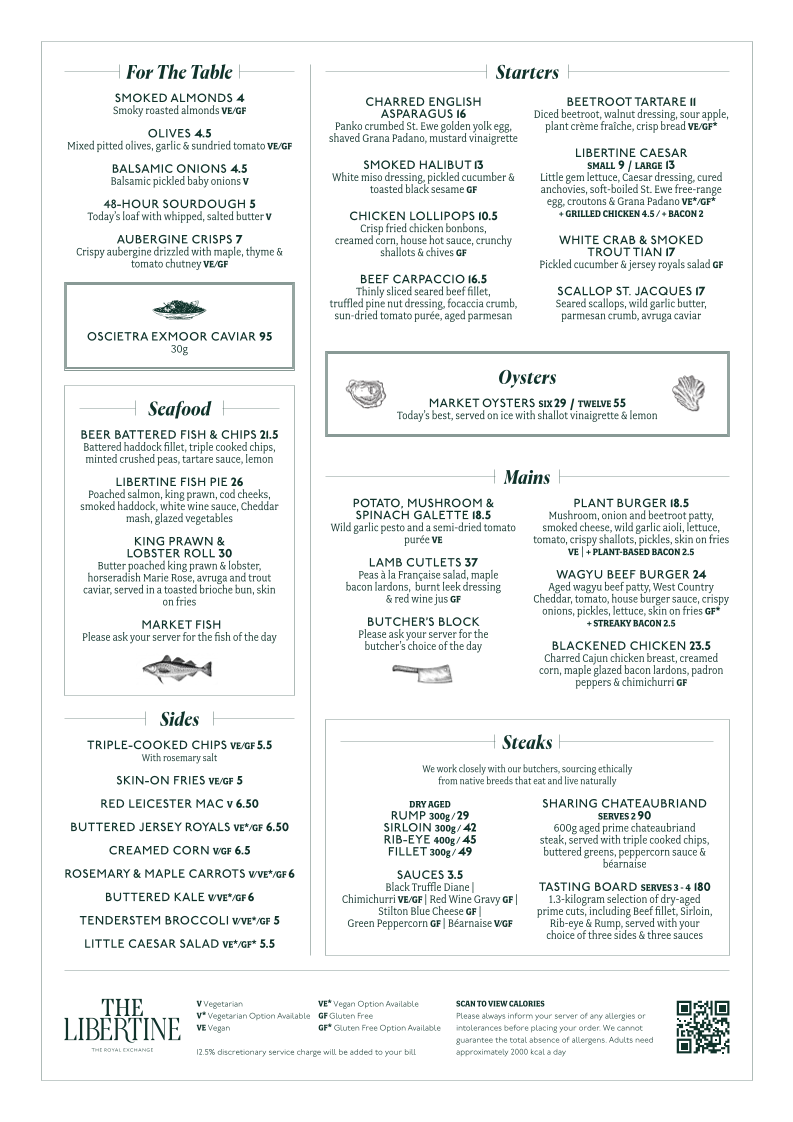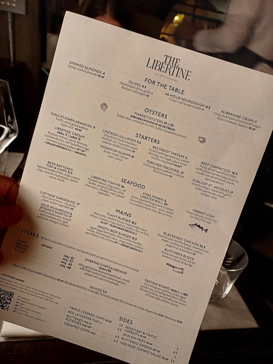 The Libertine Restaurant & Bar, nestled within London’s iconic Royal Exchange, offers a refined take on modern British and European cuisine. The menu is a celebration of classic flavors with contemporary flair, featuring standout dishes like their beer battered fish & chips—crispy haddock with minted peas and tartare sauce—and the indulgent Libertine fish pie, rich with poached salmon, king prawns, and smoked haddock under a creamy Cheddar mash. Seafood lovers will appreciate the delicate freshness of market oysters and the luxurious king prawn & lobster roll, elevated by horseradish Marie Rose and trout caviar.